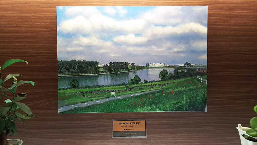 For this test order we decided on my Arakawa river painting because the apartment building we live in has a small entrance lobby and we thought it might be nice to display it there, since all residents can relate to the nearby well-loved riverside area, and would probably enjoy looking at it when passing through the lobby. When ordering the canvas print of this painting, there were 3 sizes available, the original, a larger and an even larger size. We chose the second since a larger size looks better for displaying in the lobby.
